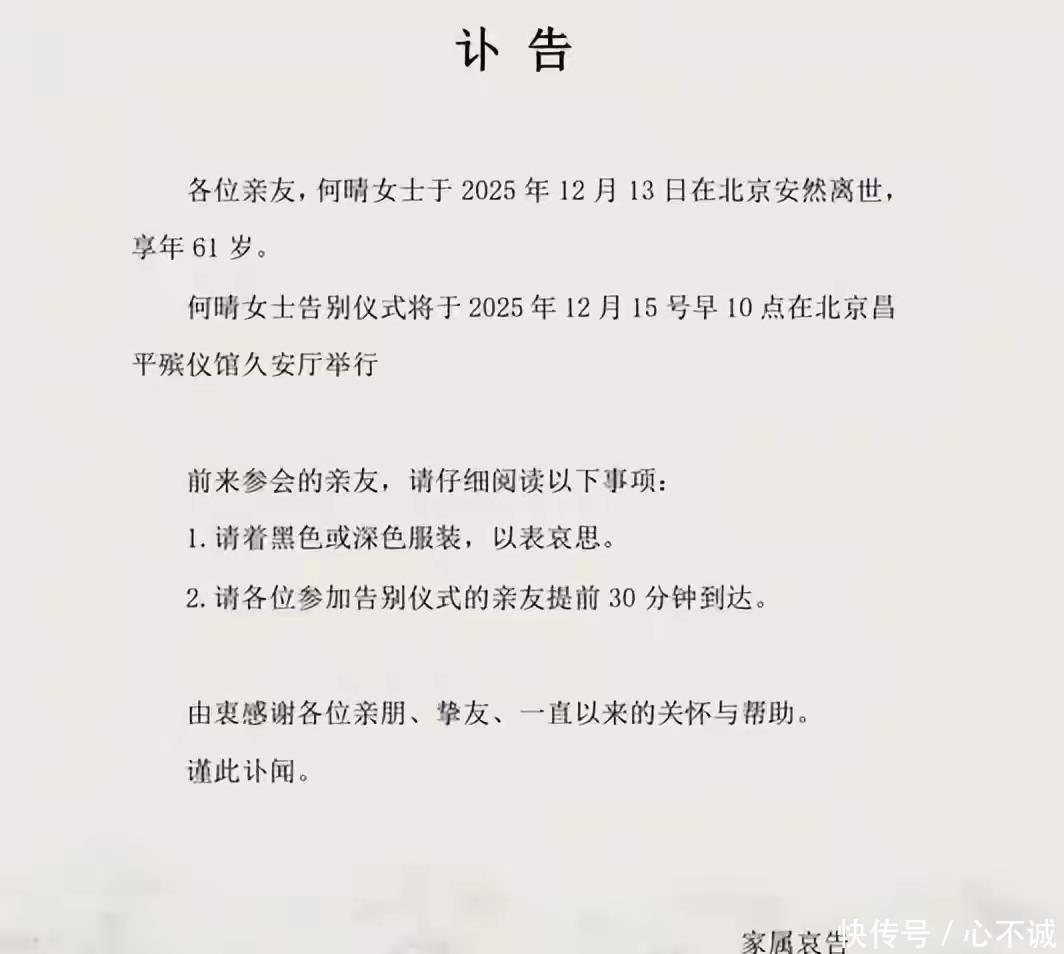 更令人唏嘘的是,何晴的家庭似乎被一种“脑血管疾病”的阴影笼罩。她是家中独女,父母都曾因脑溢血去世,如今她自己也因重病离世,家中只剩下独子许何。母亲的离去,对这个年轻人无疑是巨大的伤痛。从近期他与父亲许亚军合体拍摄杂志的情况来看,他的生活应该是由父亲在照料。或许,在生命的最后阶段,何晴早已为儿子的未来做好了安排。她的离开虽然令人悲痛,但讣告中那句“安然离世”,也让我们稍感慰藉,她走得平和,没有太多痛苦。